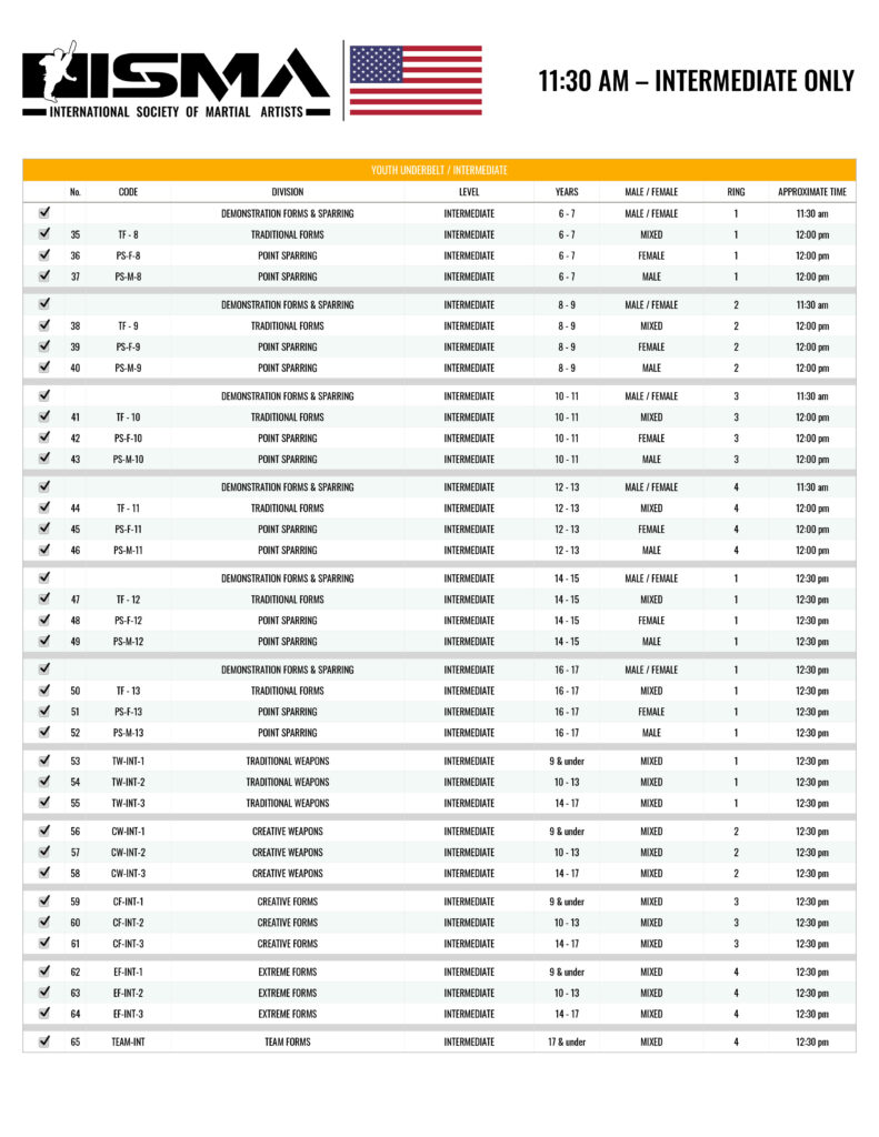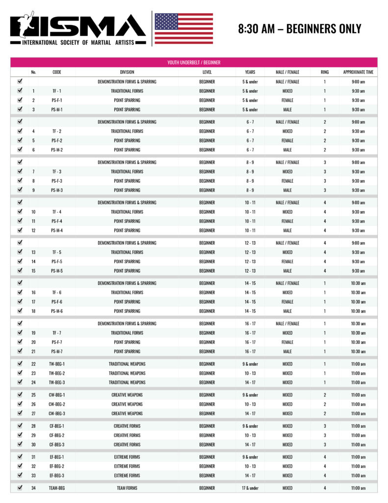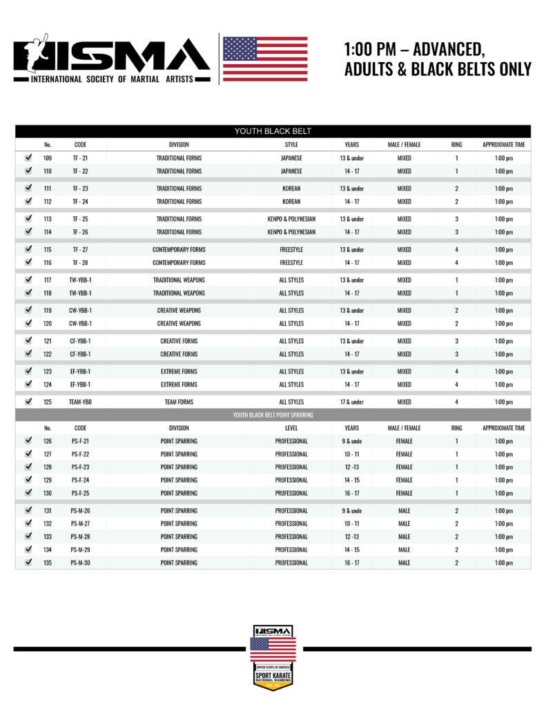 Jr. Black Belt & Under Belt Grand Champion divisions will take place during the day after all sparring divisions are completed.