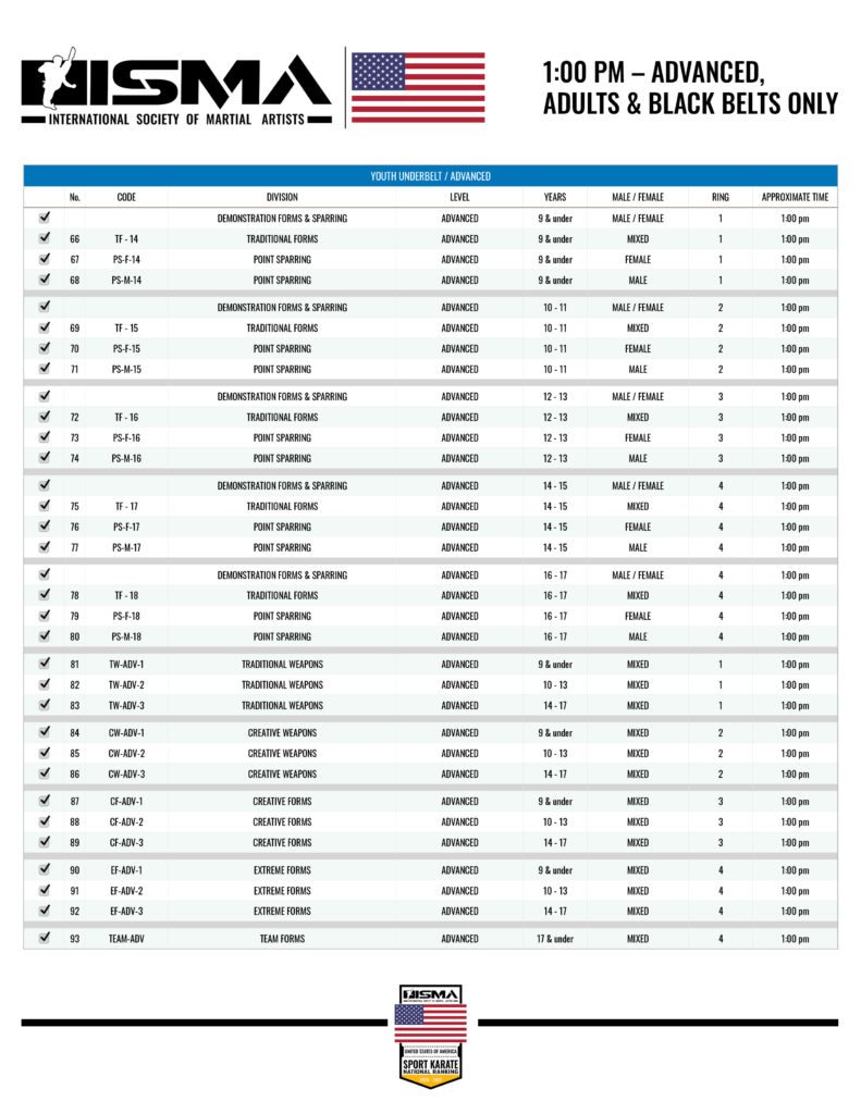 - 1:00 PM – ADVANCED, ADULTS & BLACK BELTS ONLY