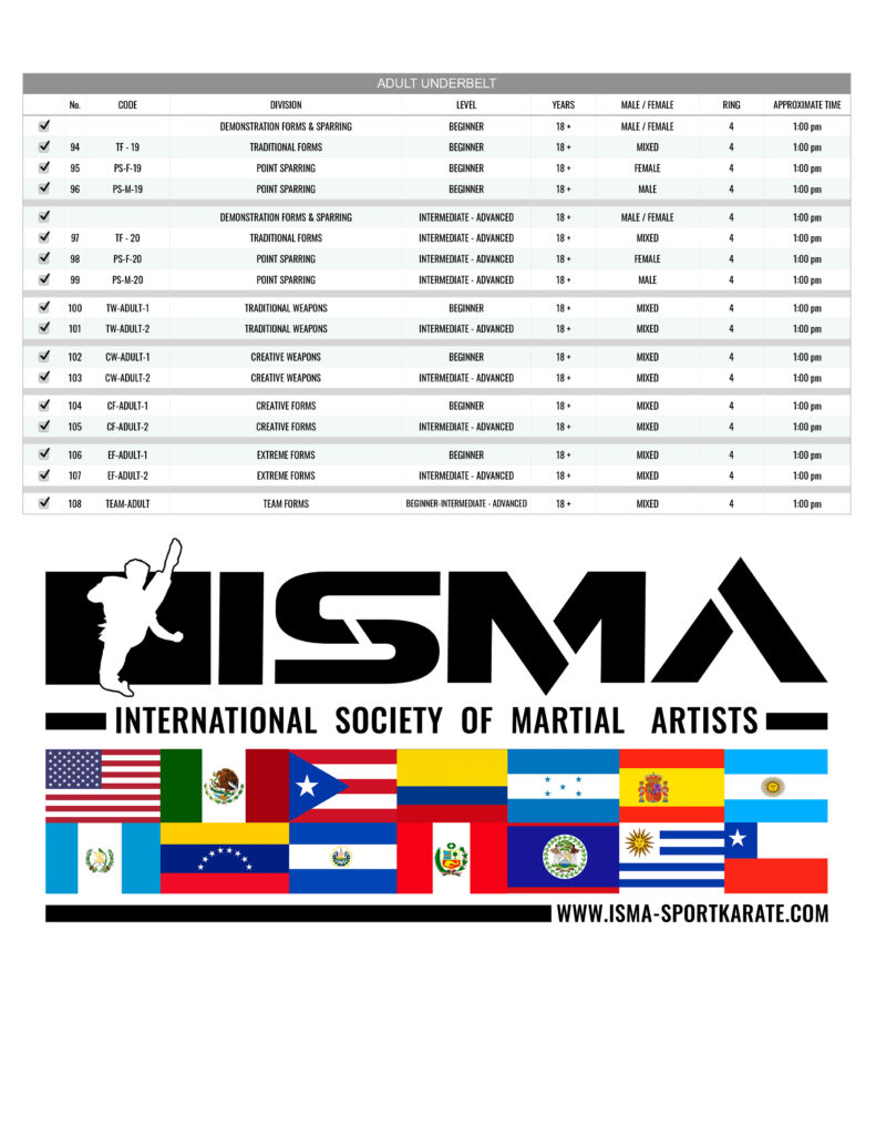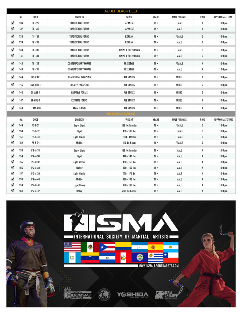Adult Black Belt & Adult Under Belt Grand Champion divisions will take place at the end of the tournament.